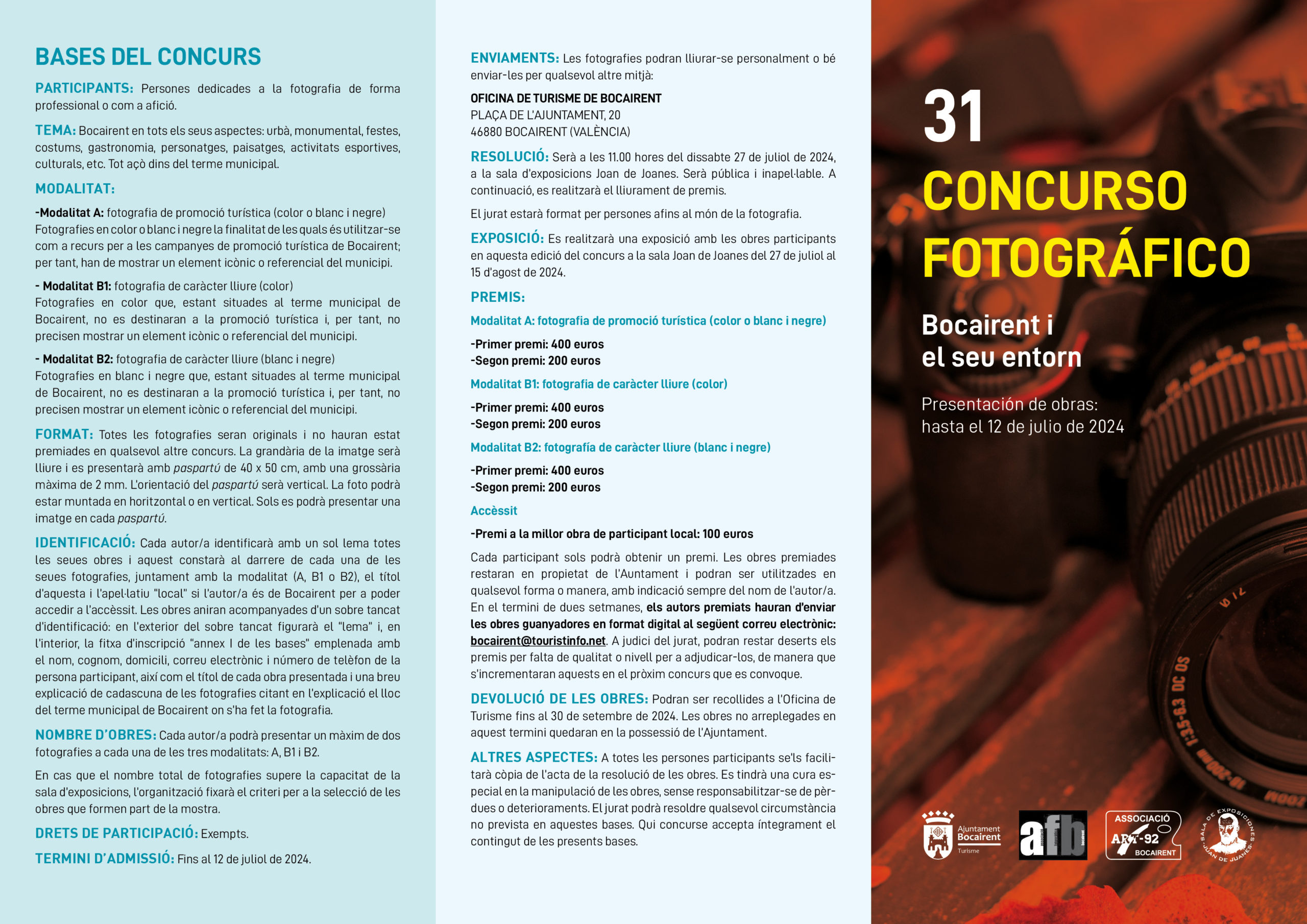 El concurs fotogràfic “Bocairent i el seu entorn” arriba aquest any a la 31a edició. Un concurs consolidat que té per objectiu mostrar espais de Bocairent des del punt de vista artístic. El període de participació acaba el 12 de juliol. A cadascuna de les tres modalitats s’atorgarà un primer premi de 400€ i un segon premi de 200€. A més, hi haurà un accèssit local, dotat amb 100€. L’exposició de les obres participants tindrà lloc del 27 de juliol al 15 d’agost a la Sala Juan de Juanes (Bocairent. A la inauguració, s’atorgaran tots els premis del concurs.